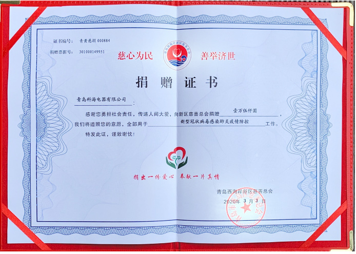 新冠肺炎全面爆发,青岛科海电器有限公司积极向有关部门捐款,为战斗一线的工作人员贡献一份力量