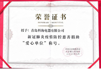 中共六汪镇委员会、六汪镇人民政府授予青岛科海电器有限公司,新冠肺炎疫情防控慈善捐助“爱心单位”称号