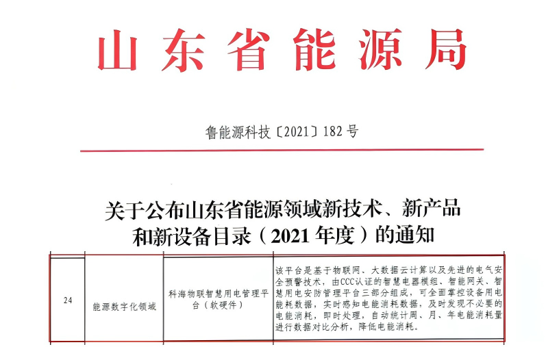 科海物联智慧用电管理平台被山东省能源局列入山东省能源领域新技术、新产品和新设备目录