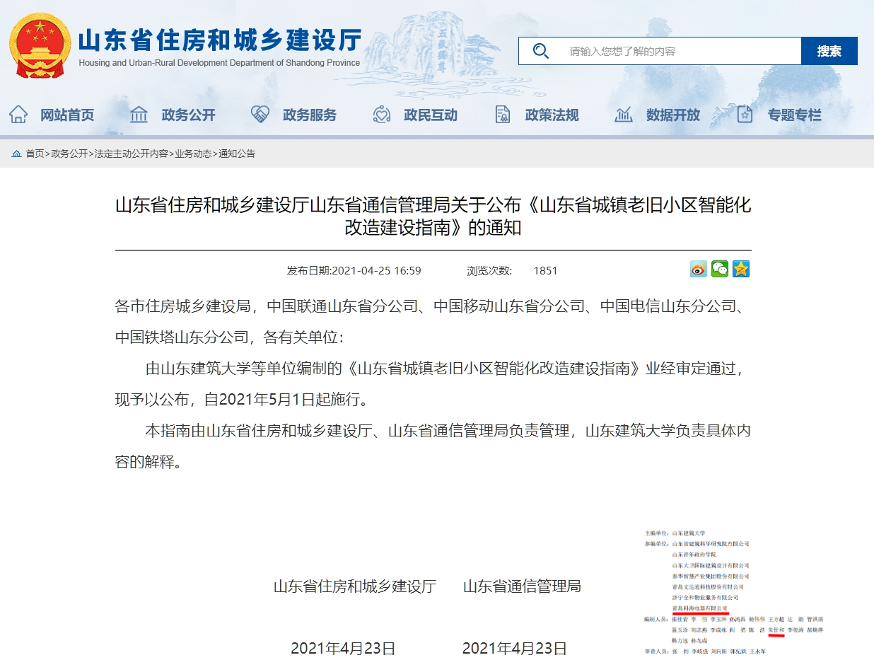 参编《山东省城镇老旧小区智能化改造建设指南》