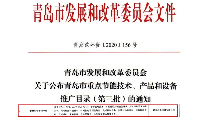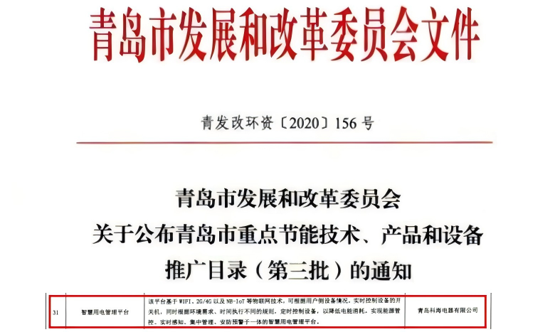 科海物联智慧用电安防管理平台被青岛发展与改革委员会,收录于“青岛市重点节能技术、产品和设备推广目录(...